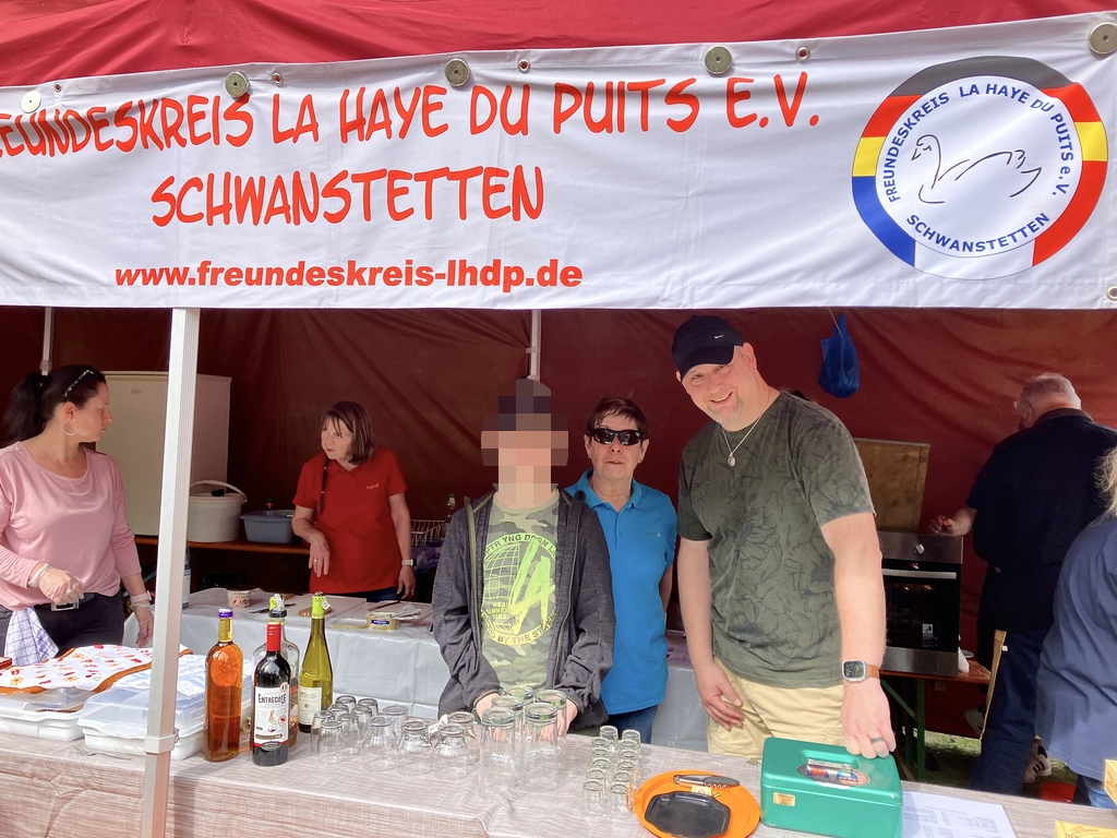 Am Samstag, den 16.08., startete morgens um 4:00 Uhr eine Abordnung des Freundeskreises am Schwanstettener Rathaus mit dem Kleinbus und einem vollgepackten Anhänger Richtung La Haye in der Normandie. Mit dabei waren Ursula Oberndörfer mit ihrer Enkelin Anna, Rosemarie Steinel, Ruth und Martin Heßdörfer, Kerstin Lawson und Karl Reibstein. Außerdem hatten wir 60 kg Bratwürstchen und etliche Kästen Bier im Gepäck.